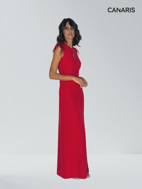A clean mermaid dress with a high neckline, enhanced by an elegant keyhole detail at the décolleté. The set-in sleeves are adorned with feathers, adding a touch of luxury and movement to the design. Hand wash with mild detergents is recommended; do not dry clean.