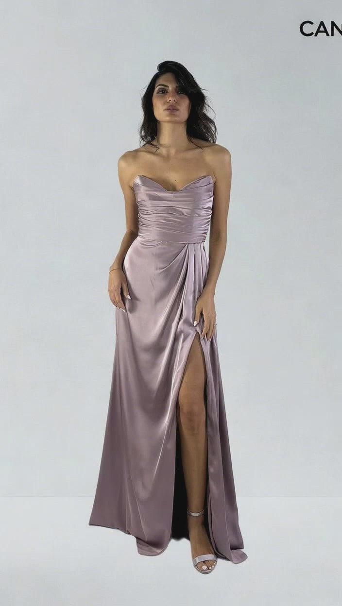 Sofisticato abito realizzato in delicato raso satin che cattura la luce in modo elegante. La silhouette fluida a trapezio si adatta perfettamente al corpo, creando un movimento che conferisce grazia a ogni passo. Il corpetto drappeggiato, con un raffinato scollo a cuore strutturato, esalta il decolleté in modo sofisticato e sensuale. Le pieghe che scendono lungo la gonna accentuano il fluire del tessuto, mentre il sensuale spacco anteriore aggiunge un tocco audace di femminilità, rivelando una bellezza senza tempo.