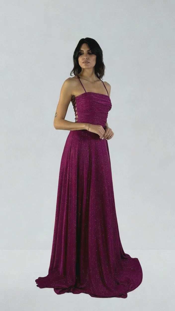 Abito in lurex dal fascino etereo e luminoso, caratterizzato da un corpetto dritto interamente drappeggiato che avvolge la silhouette con eleganza. Sul retro, il design si apre in un raffinato gioco di sensualità grazie ad un intreccio di lacci sottili che si annodano sulla schiena, creando un effetto scenografico e leggiadro. La gonna morbida cade fluida accompagnando i movimenti con leggerezza e brillantezza, per un look sofisticato e femminile, perfetto per occasioni speciali e serate indimenticabili.