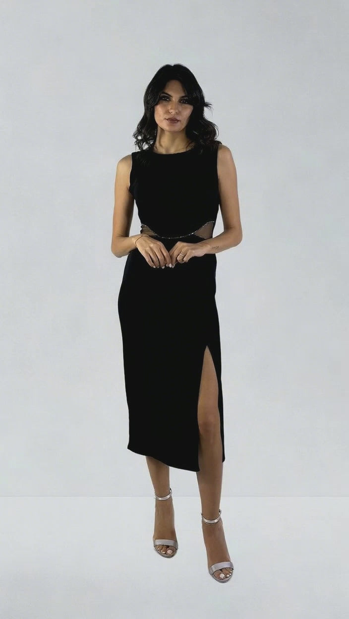Abito longuette con scollo a barchetta, dalle linee pulite e raffinate, che valorizza le spalle con uneleganza senza tempo. La schiena scoperta con scollo a U aggiunge un tocco sensuale e sofisticato, creando un contrasto armonioso con la parte frontale più classica. Sul punto vita, due triangoli in tulle impreziositi da una sottile striscia di strass definiscono la silhouette con luce e modernità. La gonna longuette, slanciata e femminile, è completata da un spacco laterale che dona movimento e un accento di allure.